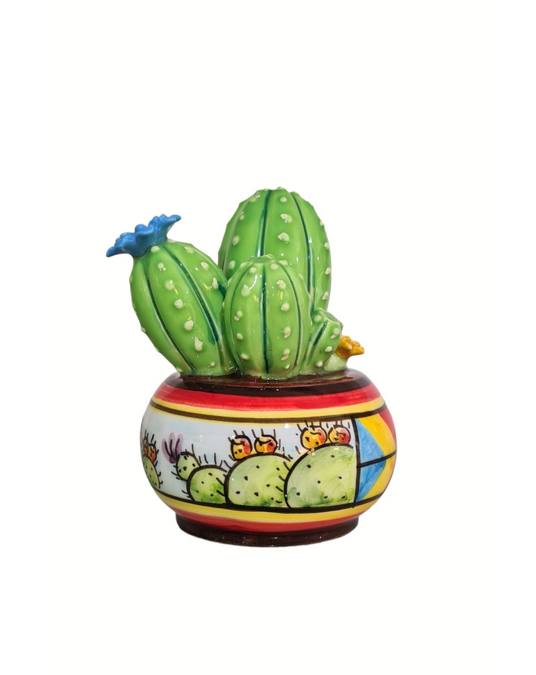 Un’interpretazione artistica e affascinante di questa pianta ispirata alla ricca tradizione artistica e culturale della Sicilia. Un cactus modellato in ceramica finemente decorato a mano da abili artigiani siciliani che hanno arricchito quest’oggetto di colore e tradizione in un mix accattivante.