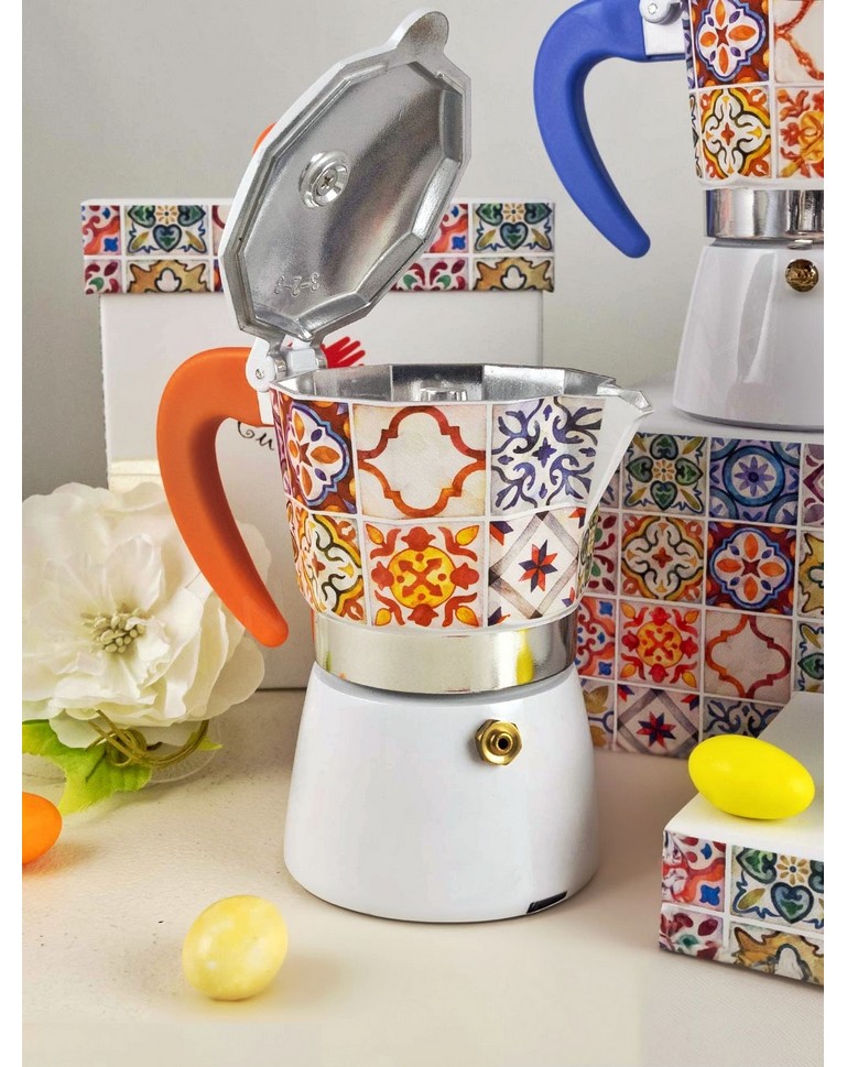 Questa elegante caffettiera incarna perfettamente lo spirito e la vivacità dei colori siciliani. Il corpo è impreziosito da un raffinato mosaico di maioliche dai motivi geometrici e floreali, che richiamano le tradizionali piastrelle artigianali tipiche dell’isola. I colori vivaci, con predominanza di blu, giallo, verde e arancio, conferiscono un tocco di allegria e calore mediterraneo tipico della splendida Sicilia. Il manico e il pomello in un colore aragosta contrastano armoniosamente con il design, evocando le tonalità accese degli agrumi siciliani e aggiungendo una nota di modernità a un oggetto che resta intrinsecamente legato alla tradizione. Questa caffettiera non è solo un oggetto funzionale, ma un vero e proprio simbolo della cultura siciliana, perfetto per arricchire la tavola con il suo fascino artigianale e il suo sapore autentico, un’idea originale e pratica per una bomboniera che sa distinguersi.