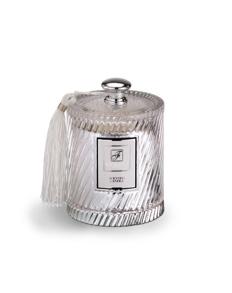 Cera profumata in contenitore realizzato in vetro, con decorazioni e coperchio raffinati ed eleganti.