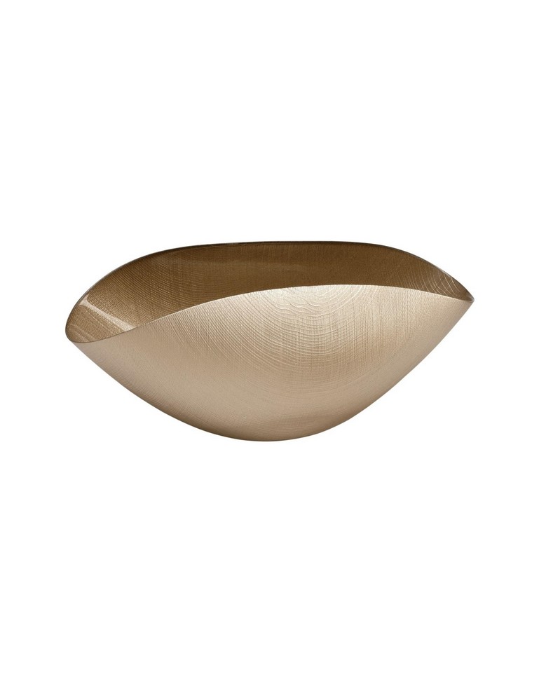 Questo centrotavola non è un semplice contenitore, ma un’opera d’arte scultorea in vetro, destinata a essere il punto focale di qualsiasi ambiente raffinato. Ispirato alla forma di una foglia, il vetro è plasmato con una curvatura armoniosa che cattura lo sguardo. La sua superficie non è liscia, ma è impreziosita da una lavorazione concentrica finemente incisa, che simula le venature naturali. Questa texture non solo conferisce profondità visiva, ma interagisce con la luce, diffondendola in un brillante color champagne che evoca immediatamente un senso di celebrazione e calore.