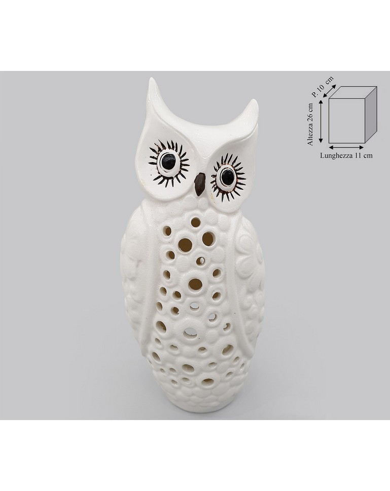 Questo elegante gufo portafortuna, realizzato in ceramica bianca, è un raffinato porta candela che aggiunge un tocco di charme e calore a ogni ambiente. La sua superficie intagliata con cura crea un gioco di luci e ombre, diffondendo una luce soffusa e suggestiva quando una candela è accesa al suo interno. Gli occhi grandi e dettagliati donano un’espressione vivace e affascinante, mentre i motivi decorativi esaltano la sua bellezza. Con dimensioni compatte ma presenza scenica, questo gufo è l’accessorio ideale per creare un’atmosfera accogliente o per un dono simbolico di fortuna e protezione.