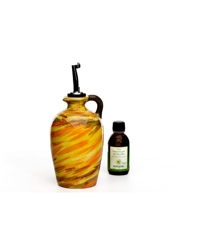 Un bellissimo oggetto da cucina che combina funzionalità e estetica. Questo design non solo offre una presa comoda durante l’utilizzo, ma aggiunge anche un tocco di eleganza e alla tua cucina. Realizzata in ceramica di alta qualità, l’oliera ad anfora è resistente e durevole. La ceramica offre anche una superficie liscia e facile da pulire. Le tonalità di colore vivaci e vibranti, aggiungono un tocco di colore e vivacità alla cucina. Il beccuccio in acciaio permette un flusso controllato dell’olio durante l’utilizzo, evitando sprechi e gocciolamenti. Compreso nella confezione un bottiglia da 50ml di olio Extravergine di oliva Bio.
