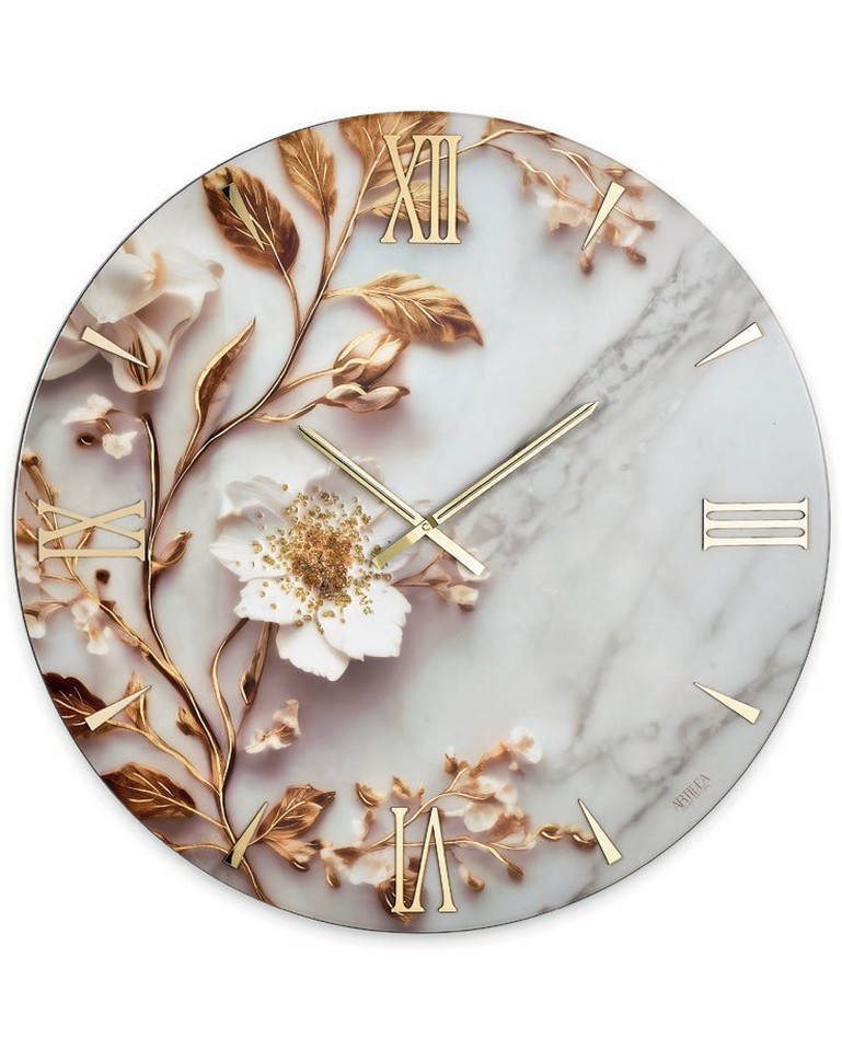 Questo elegante orologio da parete da 60 cm è un’opera d’arte realizzata su una solida base in legno, lavorata con maestria utilizzando la resina per creare una texture liscia e raffinata. La sua struttura è ulteriormente impreziosita da dettagli in foglia oro, che aggiungono un tocco di lusso e luminosità. I numeri romani, curati nei minimi dettagli, sono sapientemente realizzati in plexiglass color oro, conferendo un aspetto moderno ma al contemporaneo classico. Le decorazioni floreali, anch’esse con dettagli in oro, si fondono armoniosamente con il design marmorizzato del quadrante, creando un perfetto equilibrio tra arte e funzionalità. Un complemento d’arredo ideale per ambienti sofisticati e per aggiungere un tocco di stile ad un ambiente.