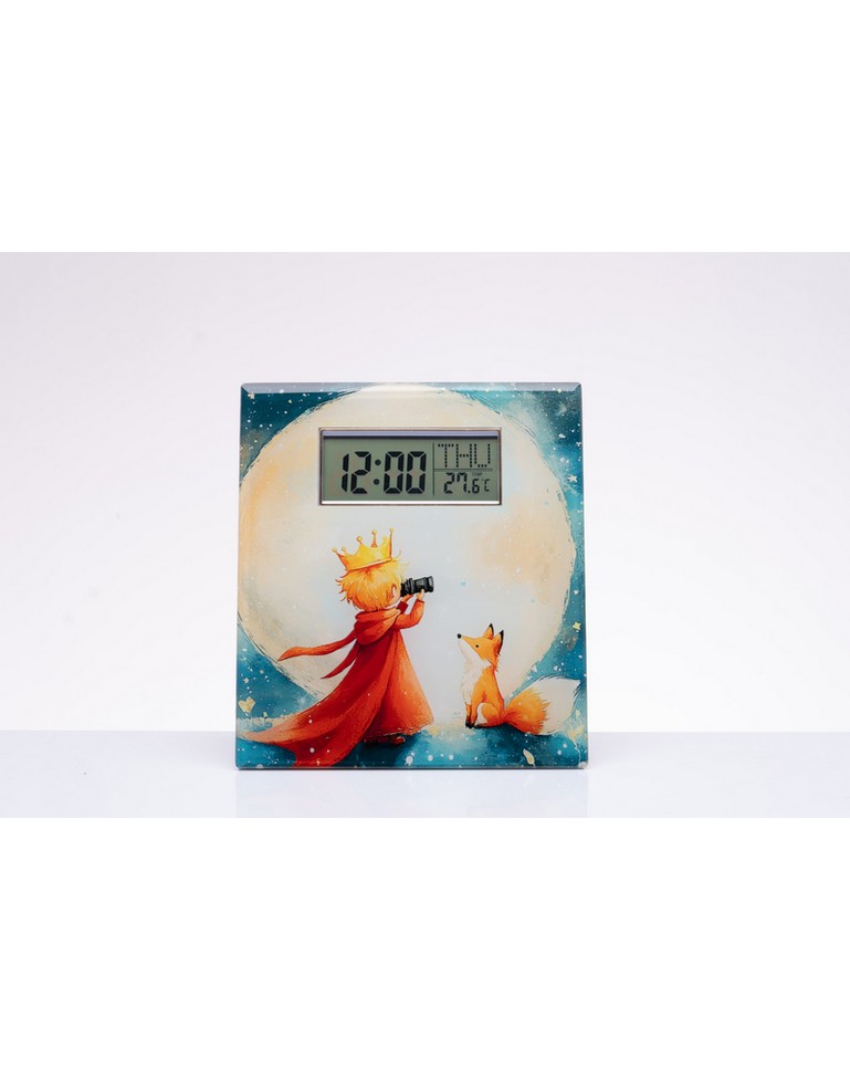Porta la magia senza tempo del Piccolo Principe sulla tua scrivania o sul tuo comodino. Questo esclusivo orologio da tavolo in vetro non si limita a misurare i minuti, ma arreda i tuoi spazi con la delicatezza di una favola che ha incantato generazioni. L’illustrazione cattura un momento di pura meraviglia: il Piccolo Principe e la sua fedele volpe, avvolti dal chiarore di una luna immensa in una notte stellata. Al centro di questo universo illustrato, un display LCD moderno e discreto ti offre tutto ciò di cui hai bisogno con una chiarezza impeccabile, Ora (12/24h): Per scandire i momenti della tua giornata. Giorno della Settimana: Per non perdere mai il filo dei tuoi progetti. Temperatura Ambiente: Un tocco di comfort tecnologico per conoscere sempre il clima del tuo rifugio personale. Grazie al suo design compatto, si adatta perfettamente sia a un ufficio moderno che a una cameretta ricca di fantasia. Il Regalo utile ed originale.