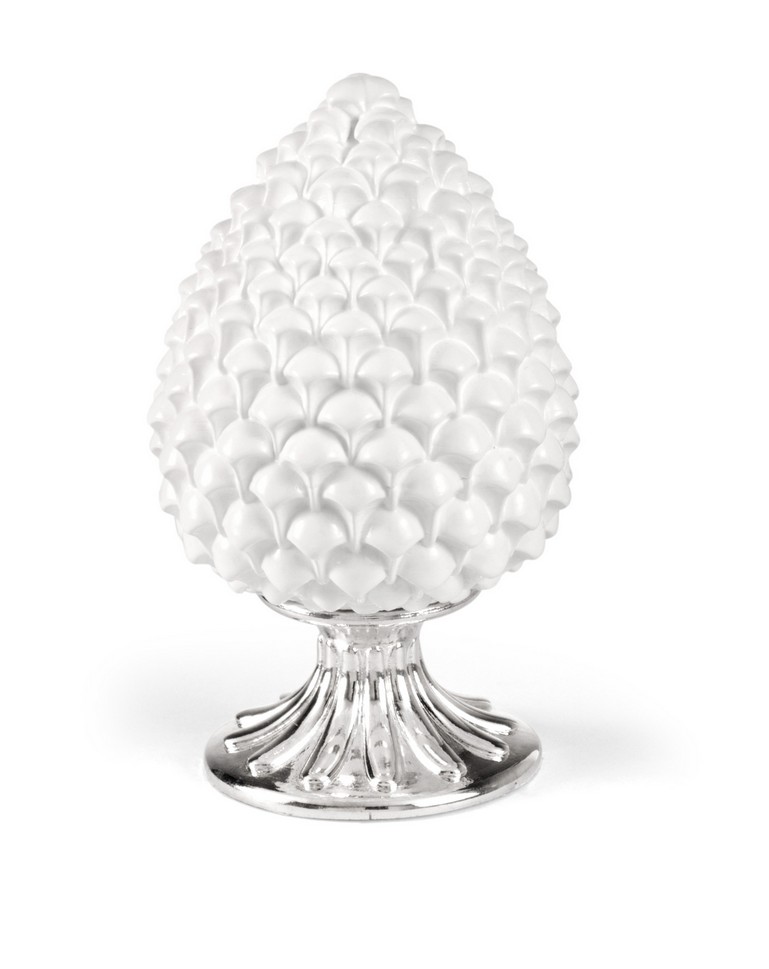 La Pigna Siciliana simbolo di fertilità, prosperità e abbondanza. Realizzata in resina bianca e base inn bagno d’argento un porta fortuna elegante he arreda.
