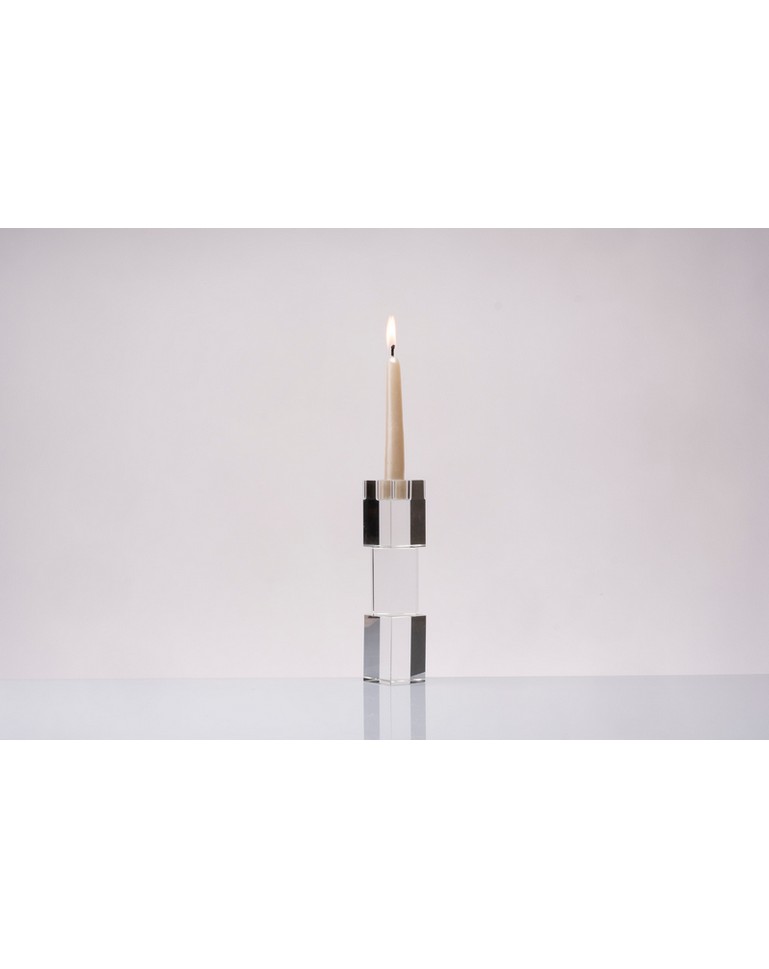 Questo esclusivo portacandele è formato da tre cubi di cristallo ottico purissimo perfettamente sovrapposti. La composizione a colonna slancia l’oggetto, creando un’impressione di altezza e leggerezza visiva. Ogni cubo in cristallo massiccio è lucidato a specchio, garantendo una trasparenza totale. La struttura a tre livelli cattura e riflette la luce da ogni angolazione, moltiplicando lo scintillio della fiamma della candela e proiettando un’atmosfera calda e sofisticata.