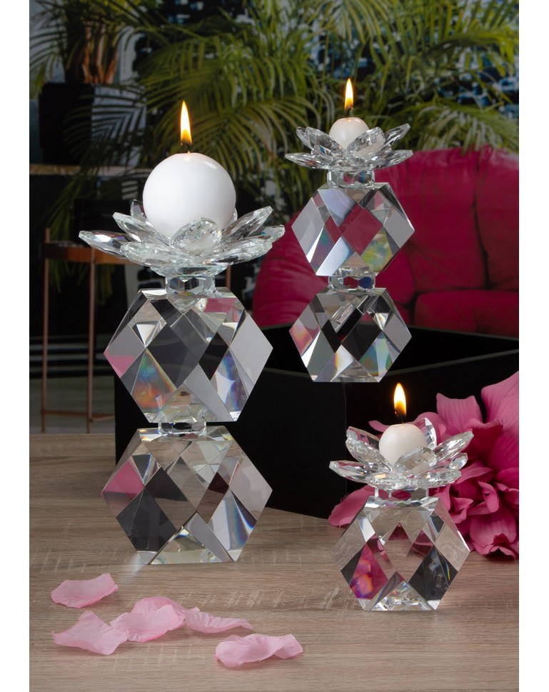 Un portacandele unico e sofisticato, composto da cubi irregolari in cristallo. Ogni cubo, dalla forma leggermente asimmetrica, riflette la luce in modi sorprendenti, creando giochi di luce e ombre che danzano sulla superficie circostante. Questi cubi, realizzati in cristallo trasparente e di alta qualità, sono disposti in modo apparentemente casuale, ma con un equilibrio estetico che cattura l’attenzione. Sopra questo elegante assemblaggio di cubi, un fiore in cristallo lavorazione swarovski aggiunge un tocco finale di lusso e raffinatezza. Il fiore è finemente lavorato, con petali delicati e dettagli intricati che evidenziano la maestria artigianale. Ogni petalo cattura e rifrange la luce, creando un effetto scintillante e colorato che varia a seconda dell’angolazione della luce. Il portacandele non solo funge da pratico supporto per una candela, ma si presenta anche come un’opera d’arte decorativa. Quando la candela è accesa, la luce passa attraverso i cubi di cristallo, creando un’atmosfera magica e sofisticata. Il fiore in cima sembra quasi prendere vita, brillando come un gioiello prezioso al centro di una composizione artistica. Questo portacandele in cristallo è perfetto per aggiungere un tocco di eleganza a qualsiasi ambiente, sia esso un salotto, una sala da pranzo o una camera da letto, e rappresenta un regalo ideale per chi ama oggetti di design unici e raffinati.