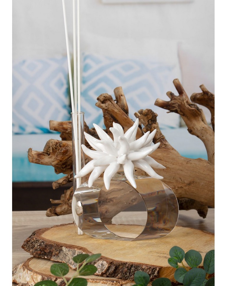 Il design raffinato ed elegante fa di questo oggetto più che un profuma ambiente un vero gioiello per la casa. Realizzato in cristallo italiano e adornato con un Riccio Bianco realizzato in porcellana, questo profuma ambiente è il complemento che serve per dare quel tocco di eleganza ad un ambiente.