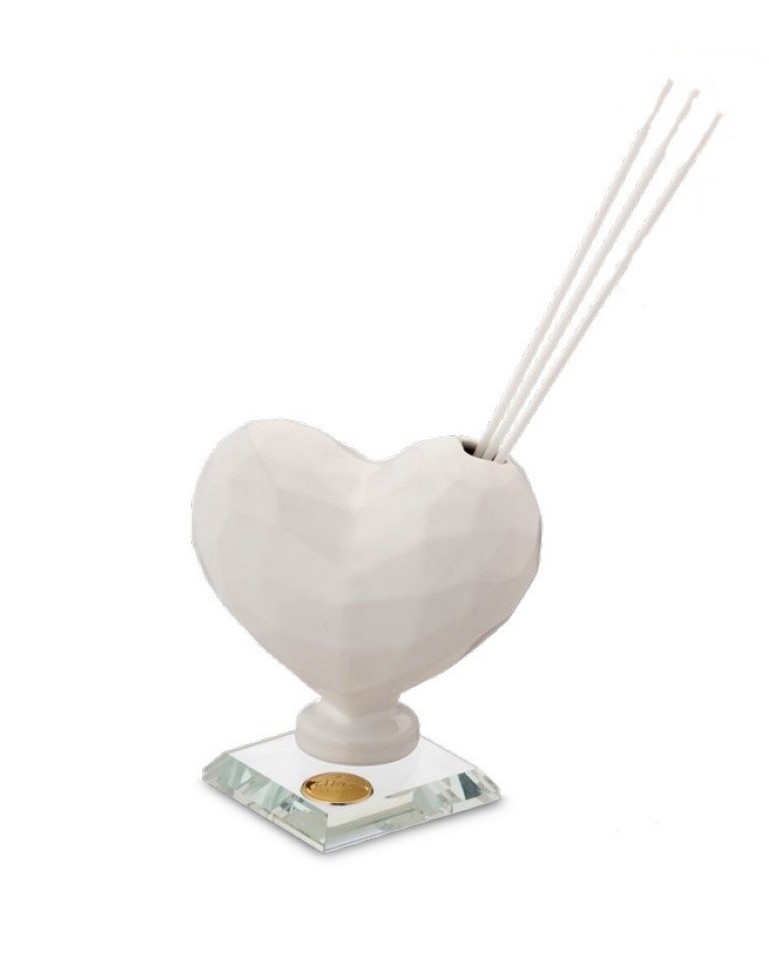 Questo raffinato diffusore di fragranze incarna un’eleganza senza tempo, perfetto per impreziosire qualsiasi ambiente con un tocco di classe e sofisticatezza. La sua forma a cuore, geometrica e sfaccettata, richiama le sfumature di un diamante, esaltando la purezza del bianco lucido. Adagiato su una base di cristallo trasparente, il design si distingue per la sua armoniosa fusione tra modernità e romanticismo, con un piccolo dettaglio dorato che aggiunge un accento di lusso discreto. Le bacchette profumate, slanciate e leggere, si slanciano con grazia, diffondendo nell’aria note olfattive che trasformano l’ambiente in un’oasi di benessere. Perfetto per salotti eleganti, camere da letto sofisticate o studi dallo stile ricercato, questo diffusore non è solo un complemento d’arredo, ma un autentico elemento di design che regala un’esperienza sensoriale esclusiva.