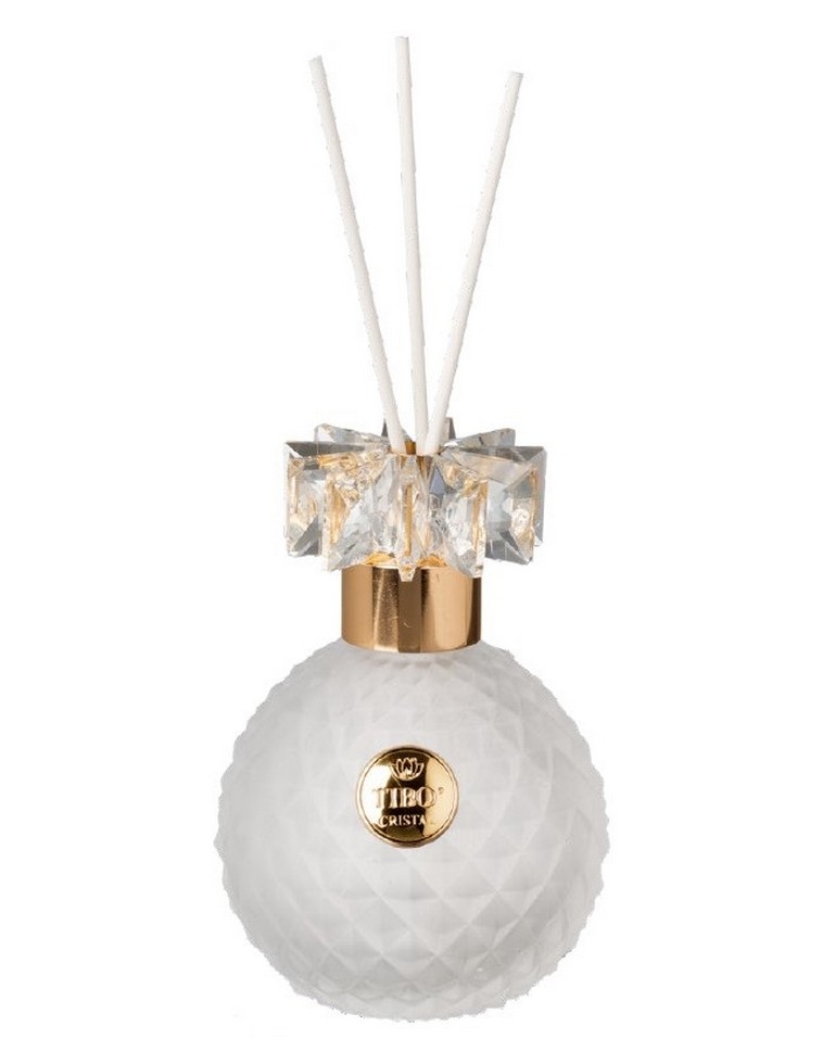 Questo profumatore d’ambiente incanta con la sua bellezza raffinata e il design intramontabile. La base in cristallo satinato, lavorata con originali forme geometriche, richiama l’eleganza classica di una preziosa ampolla. La sommità è decorata con un elegante decoro in cristallo brillante, le cui estremità scintillano come diamanti sotto la luce, creando un’atmosfera di lusso discreto. Il collo in metallo dorato aggiunge un dettaglio contemporaneo, creando un perfetto equilibrio tra tradizione e contemporaneità. All’interno, il profumo sprigiona fragranze sublimi e avvolgenti, ideali per creare un ambiente rilassante e sofisticato. Questo profumatore non è solo un oggetto funzionale, ma un’opera d’arte decorativa, perfetta per impreziosire qualsiasi spazio.