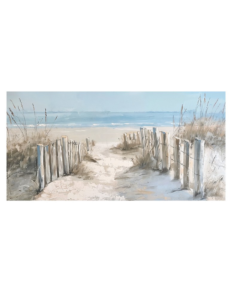 Con una palette delicata che spazia dall’azzurro polvere alle tonalità calde della sabbia, l’opera cattura quel momento magico in cui il sentiero tra le dune rivela finalmente l’immensità del mare. I toni neutri del beige e del corda si fondono con le sfumature cerulee del cielo e dell’acqua, rendendo questo quadro perfetto per ambienti che ricercano luminosità e armonia. La staccionata in legno, resa con pennellate decise e naturali, guida l’occhio verso l’orizzonte, creando un senso di ampiezza che visivamente “allarga” i confini della tua stanza. Tela montata su telaio, leggera e facile da installare. Un soggetto classico reinterpretato con una sensibilità moderna che non passerà mai di moda.