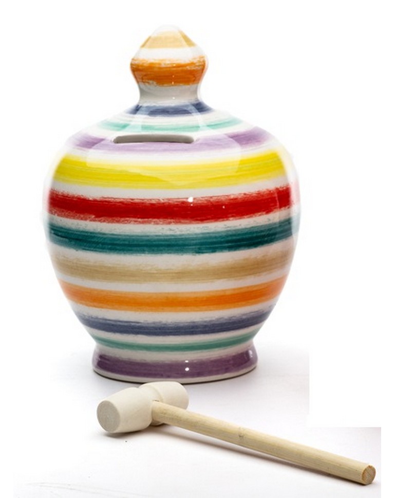 grazioso salvadanaio in ceramica, splendidamente decorato con vivaci righe colorate, perfetto per aggiungere un tocco di allegria e praticità alla tua casa. Nella sua base vi è posto un tappo in silicone che rende agevole lo svuotamento. Nella confezione è compreso un simpatico martello in legno.