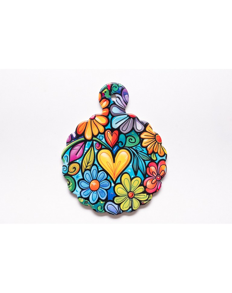 Il sottopentola “Solaris” non è un semplice accessorio da cucina, ma un vero e proprio quadro in ceramica che celebra la gioia del convivio. Il suo design vivace, caratterizzato da un rigoglioso giardino di fiori pop e un cuore centrale radioso, trasforma ogni pranzo in un’occasione speciale, portando calore e colore direttamente al centro della tua tavola. La parte superiore, lucida e resistente al calore, permette di appoggiare pentole, pirofile o teiere bollenti senza timore. Il retro è interamente rivestito in sughero offre un isolamento termico impeccabile e garantisce una presa antiscivolo, proteggendo anche le tovaglie e le superfici più delicate da graffi e calore. Il bordo ondulato e la forma circolare donano un tocco dinamico e morbido, rendendolo splendido da vedere anche quando non viene utilizzato, magari appeso come elemento decorativo.
