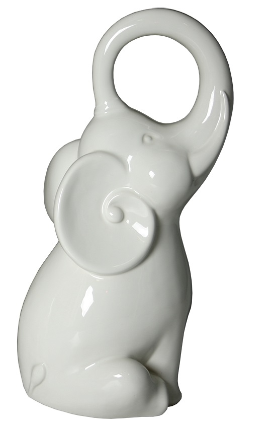 Elefante in ceramica bianca con proboscide alzata, simbolo di fortuna, pazienza,