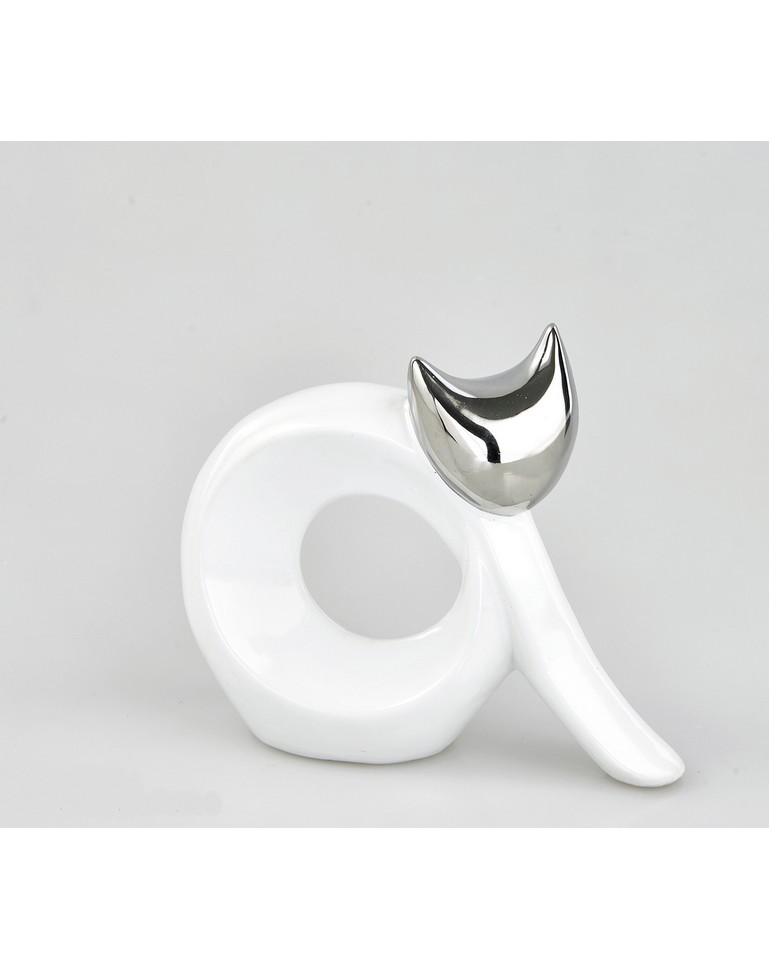 Aggiungi un tocco di allegra eleganza e design minimalista al tuo spazio con questa scultura in ceramica che cattura l’essenza giocosa di un gatto acciambellato. La sua forma stilizzata, con una spirale sinuosa che forma il corpo e una testa argentata che spunta con curiosità, è un’interpretazione moderna e affascinante della figura felina. Il contrasto tra la purezza del bianco lucido della ceramica del corpo e la lucentezza argentata della testa crea un punto focale accattivante e contemporaneo. La superficie riflettente della testa cattura la luce, aggiungendo un elemento di brillantezza e dinamismo all’opera. La forma a spirale suggerisce movimento e comfort, evocando l’immagine di un gatto pronto a giocare o a sonnecchiare. Questa scultura è un omaggio alla natura giocosa e indipendente dei gatti, reinterpretata in chiave di design moderno. Perfetta per gli amanti dei felini e per chi apprezza l’arredamento con un tocco di originalità e ironia, si adatta con stile a mensole, librerie, scrivanie o angoli che necessitano di un elemento distintivo.