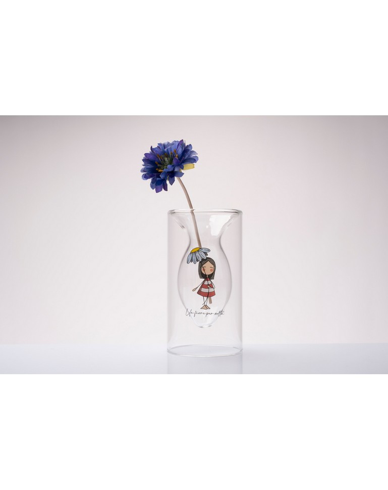 Realizzato in vetro borosilicato d’alta qualità, questo vaso non si limita a contenere un fiore, ma lo mette in scena all’interno di un’architettura di trasparenze. Il design a doppia camera crea un sofisticato effetto ottico: il cuore del vaso, dalla silhouette sinuosa, sembra fluttuare all’interno di un cilindro in vetro trasparente, donando leggerezza e modernità a ogni superficie. L’illustrazione poetica della linea “La Tipa”, ritratta mentre si ripara dolcemente sotto un grande petalo, è accompagnata dalla calligrafia delicata “Un fiore per volta. La struttura a doppia camera non è solo un dettaglio estetico, ma un segno distintivo di design contemporaneo che valorizza lo stelo del fiore come se fosse parte di un’installazione d’arte. Il vetro borosilicato garantisce una brillantezza che non svanisce nel tempo, riflettendo la luce naturale e amplificando i colori del fiore scelto.