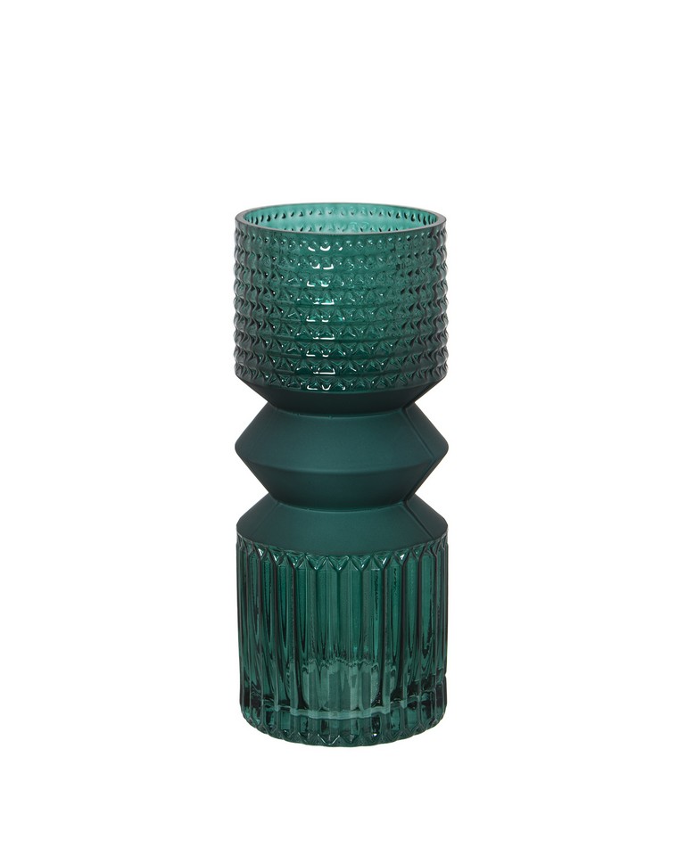 Questo vaso in vetro non è solo un contenitore per fiori, ma una vera e propria scultura di design. Il colore verde smeraldo profondo è declinato in tre lavorazioni differenti che giocano con i volumi e la rifrazione luminosa. La forma a clessidra stilizzata lo rende perfetto per ambienti che seguono uno stile minimalista, industrial o urban chic, garantendo un impatto visivo immediato e sofisticato.