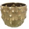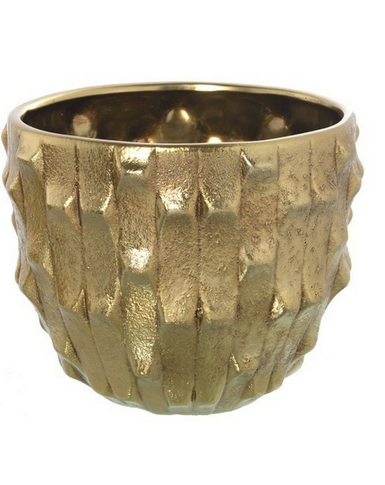 Realizzato in ceramica il vaso è interamente rivestito con una finitura oro caldo e antichizzato. La sua superficie è lavorata in modo audace con una trama geometrica a rilievo che ricorda le sfaccettature di un diamante grezzo. Questa texture crea un gioco di luci e ombre dinamico che impedisce all’oro di risultare piatto, conferendogli invece un aspetto vissuto e prezioso. La forma compatta e la lucentezza calda lo rendono l’accento perfetto per qualsiasi ambiente, dal Bohemian Chic al Mid-Century Glam. È ideale per accogliere una singola pianta succulenta o per essere utilizzato come elegante portaoggetti. Il “Gemma Tribale” è l’investimento in un dettaglio che eleva istantaneamente l’atmosfera di qualsiasi stanza.