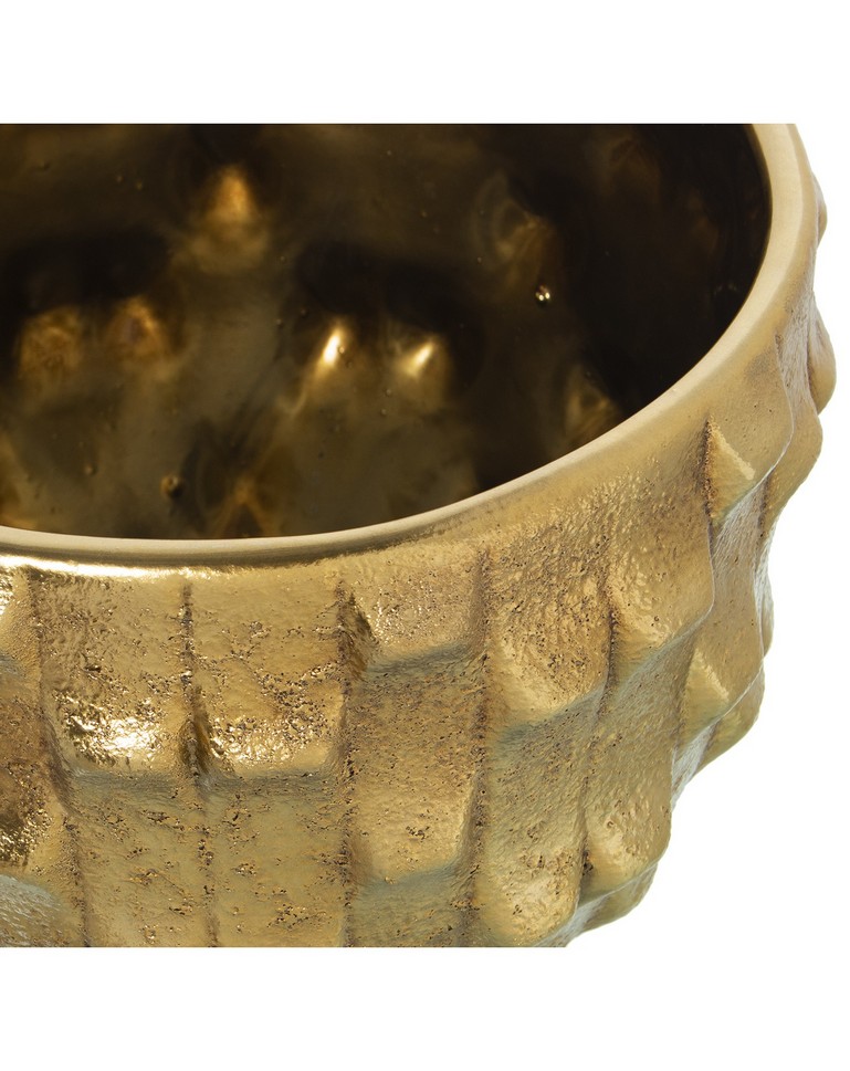 Realizzato in ceramica il vaso è interamente rivestito con una finitura oro caldo e antichizzato. La sua superficie è lavorata in modo audace con una trama geometrica a rilievo che ricorda le sfaccettature di un diamante grezzo. Questa texture crea un gioco di luci e ombre dinamico che impedisce all’oro di risult…